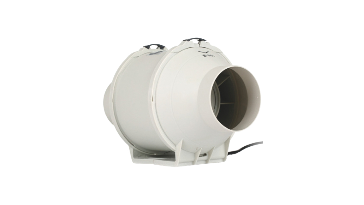 Aspirador helico-centrífugo con hélices en ABS y carcasa en polipropileno, de dimensiones compactas para ventilación eficiente en espacios reducidos.